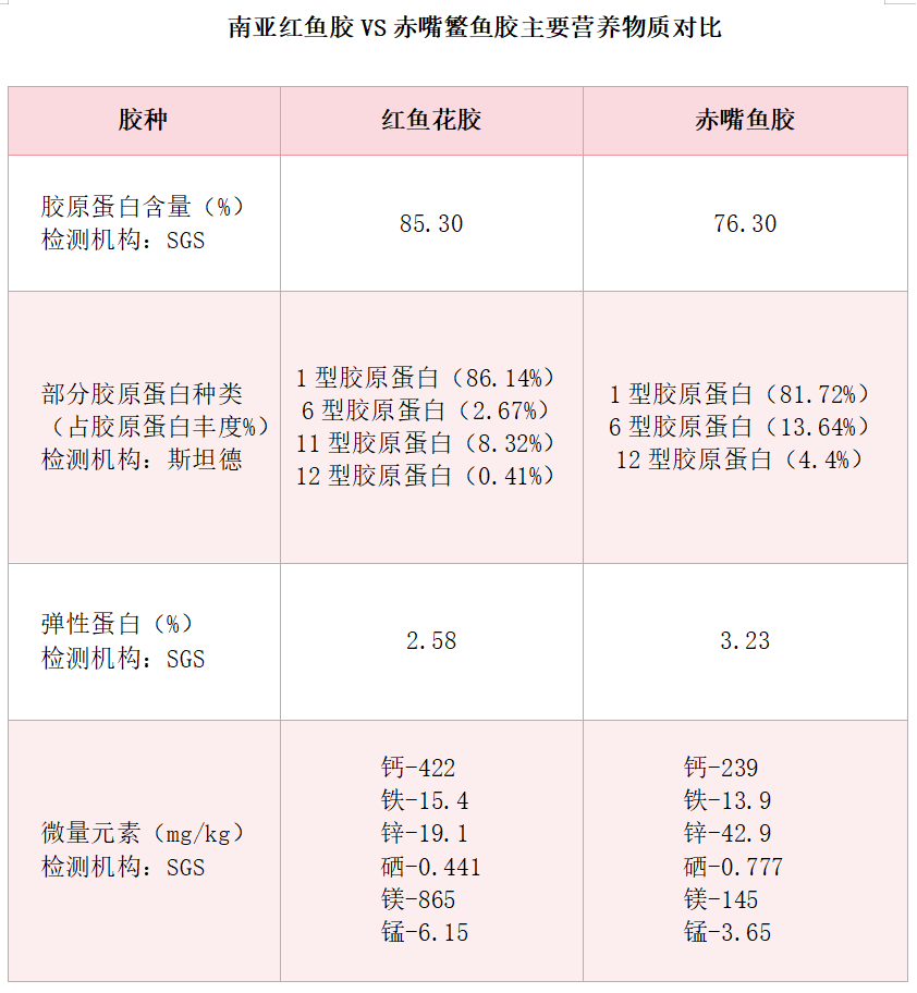 近年来对于鱼胶营养价值的研究更是表明,南亚红鱼胶的胶原蛋白含量高达85.3%,且胶原蛋白种类丰富,尤其6型胶原蛋白含量突出——而6型胶原蛋白,就是子宫、真皮、软骨组织的关键组成部分。